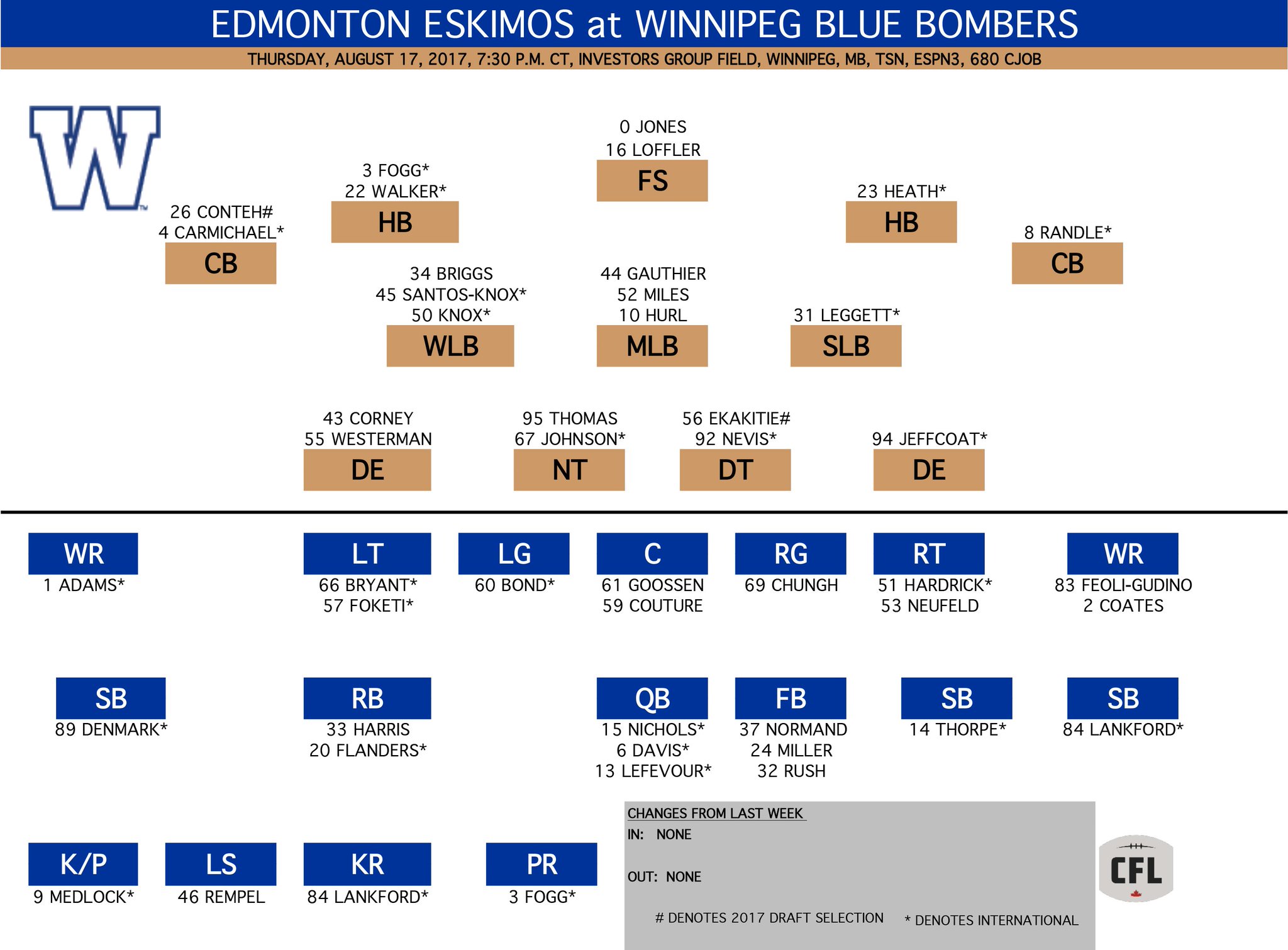 I don't want to take anything away from the Bombers because they are a good team but I feel like we've matched up well against them in the Mike Reilly era the last few years. And we seem to be able to win at IGF even when the Bombers are playing well. So given that we're getting some help back on the OLine and in the receiving core, I think we can win this one if the Dline can have a big game pressuring Nichols and stuffing Harris (the Esk killer) without Mondo in the lineup.